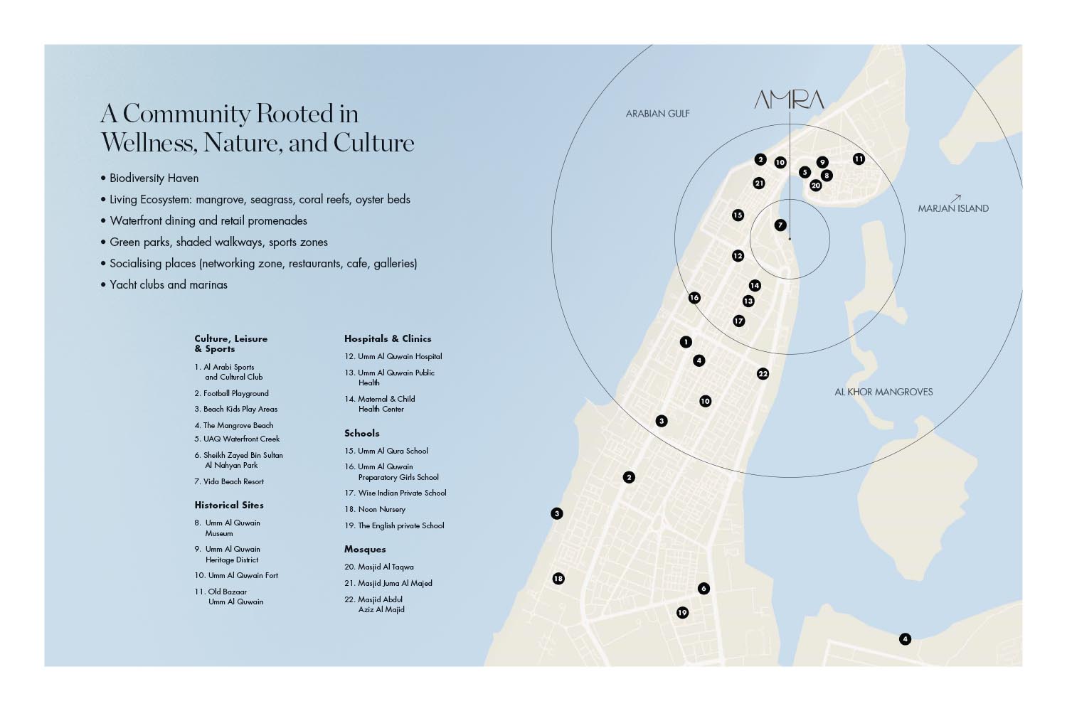 Situated in a pristine coastal ecosystem, AMRA is at the heart of a rapidly growing neighborhood in UAQ, surrounded by premium hospitality and branded residences such as Vida Resort, 25 Hours Hotel & Residences, and Beach Residences. Its proximity to Marjan Island in Ras Al Khaimah—soon to be the vibrant hub for nightlife and home to the iconic Wynn Casino—makes AMRA a perfect family-friendly, wellness-centric retreat for overflow visitors, staycationers, and discerning investors alike. Built to meet at least seven key sustainability initiatives, AMRA is more than just a place to live; it’s a conscious lifestyle choice where nature, community, and holistic wellness come together in perfect harmony.